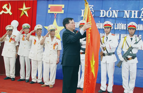 Nguyên Chủ tịch nước Nguyễn Minh Triết gắn Huy hiệu Anh hùng Lực lượng vũ trang lên Quân kỳ |