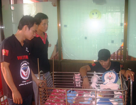 Thành (ngồi bên nôi) thăm các trẻ mồ côi tại trung tâm nuôi dạy trẻ mồ côi. |