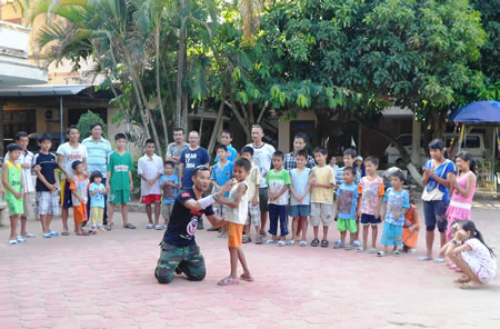 Thành vui chơi với trẻ mồ côi ở tỉnh Quảng Ngãi trong chuyến đi xuyên Việt. |