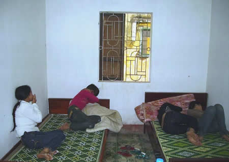 2 cánh cửa bật mở, bên trong là 2 cặp nam nữ không một mảnh vải che thân đang quấn chặt lấy nhau. Bị bắt quả tang, 4 đối tượng mua bán dâm đã cúi đầu khai nhận hành vi của mình, đồng thời ký vào biên bản phạm tội quả tang. Tại CQĐT, bước đầu 2 gái bán dâm khai nhận tên là Trần Thị H. (1991, quê Quảng Nham, H. Quảng Xương, tỉnh Thanh Hóa) và Ngô Thị L. (1987, quê xã Hưng Thịnh, H. Hưng Nguyên, Nghệ An), đều là nhân viên “ruột” của bà chủ Phan Thị Thanh Trà.