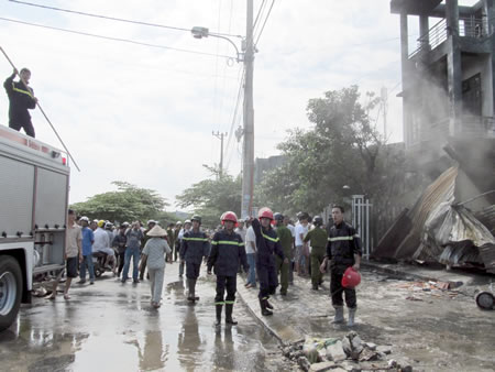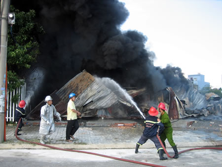 (Cadn.com.vn) - 10 giờ 20 ngày 12-11, tại Phân khu D đường 7,5m KDC Trung Nghĩa thuộc tổ 33, P. Hòa Minh, Q. Liên Chiểu, TP Đà Nẵng xảy ra vụ cháy lớn tại xưởng sản xuất đồ phế liệu do anh Lê Công Cẩn (1971, trú P. Mân Thái, Q. Sơn Trà) làm chủ. Ngay sau khi đám cháy xảy ra, lực lượng CSPCCC TP Đà Nẵng đã huy động 7 xe chữa cháy nhanh chóng đến để dập tắt đám cháy. Tuy nhiên, do vật cháy là xốp nên đám cháy lan rất nhanh, chỉ trong chưa đầy 15 phút, toàn bộ xưởng sản xuất phế liệu đã bị thiêu rụi. Vụ cháy này đã làm ngôi nhà nằm sát bên xưởng sản xuất phế liệu của bà Nguyễn Thị Nghỉ bị ảnh hưởng nặng.