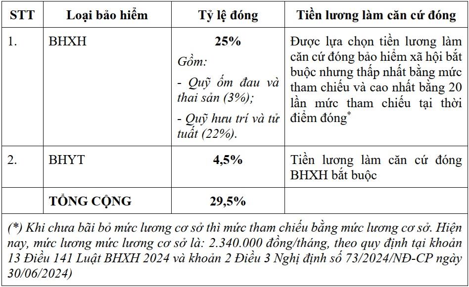 Người sử dụng lao động có nghĩa vụ đóng: 17,5% tiền lương làm căn cứ đóng BHXH bắt buộc. Trong đó bao gồm: 3% tiền lương vào quỹ ốm đau và thai sản (Điểm a khoản 1 Điều 34 Luật BHXH 2024); 14% tiền lương vào quỹ hưu trí và tử tuất (Điểm b khoản 1 Điều 34 Luật BHXH 2024); 0.5% tiền lương vào quỹ tai nạn lao động, bệnh nghề nghiệp (Điểm a khoản 2 Điều 43 NĐ 158/2025/NĐ-CP ngày 25/06/2025).