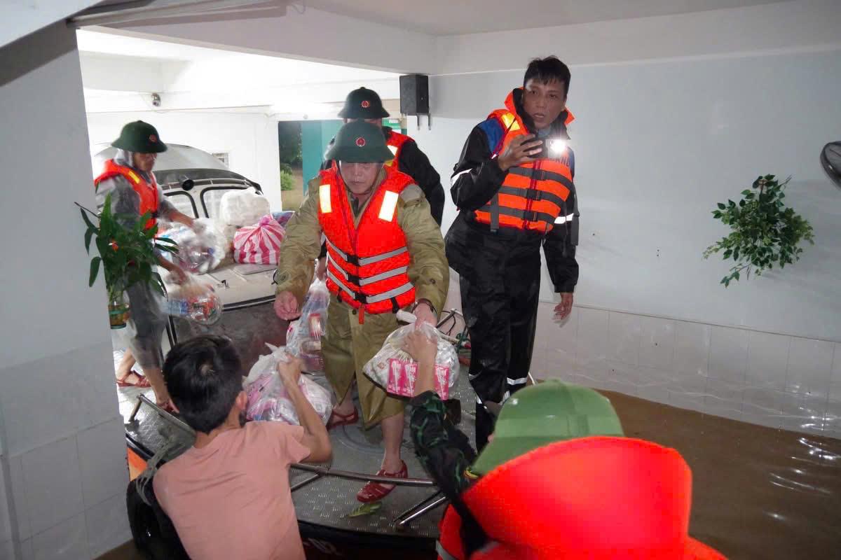 Tại đây, Đại tá Trần Hữu Ích chỉ đạo lực lượng hỗ trợ nhân dân vận chuyển tài sản lên cao, cung cấp lương thực, nước uống và các nhu yếu phẩm thiết yếu, giúp bà con yên tâm ứng phó trong điều kiện nước lũ vẫn còn dâng cao.