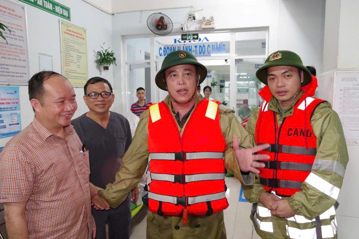 Đến Bệnh viện Đa khoa khu vực Quảng Nam, Chỉ huy trưởng Bộ CHQS TP Đà Nẵng động viên Ban Giám đốc bệnh viện, chia sẻ khó khăn với tập thể cán bộ, nhân viên y tế, trực tiếp tặng quà và chỉ đạo lực lượng quân sự nhanh chóng tăng cường phương tiện vượt ngập, vận chuyển lương khô, bánh mì, nước uống vào bệnh viện, bảo đảm duy trì khám chữa bệnh an toàn, thông suốt cho 1.400 bệnh nhân tại đây.