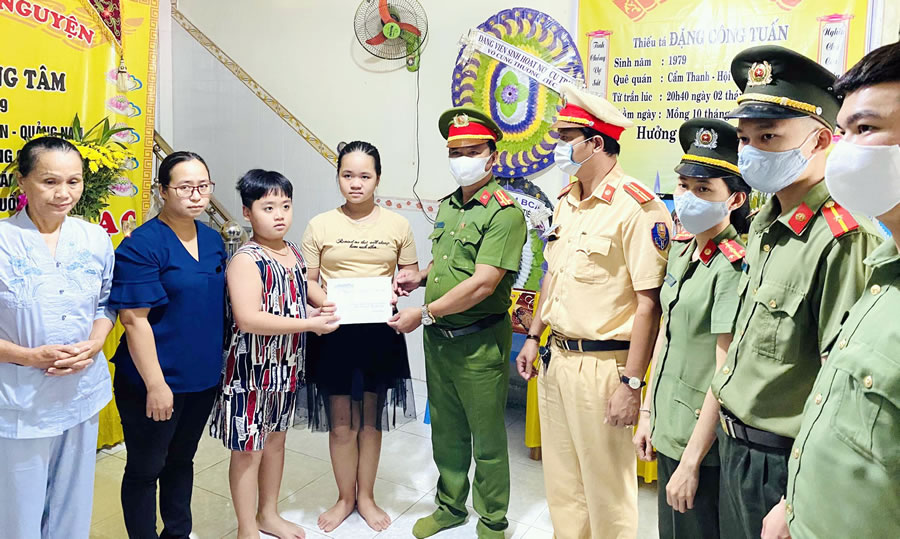 Đà Nẵng- CAH Hòa Vang (Đà Nẵng) chiều ngày 14-4 đến thăm và trao số tiền hỗ trợ 30 triệu đồng trích từ Quỹ "Lương nghĩa tình" của đơn vị nhằm chia sẻ khó khăn, mất mát với gia đình Thiếu tá Đặng Thanh Tuấn (cán bộ Đội CSGT-TT) và Thượng sĩ Võ Văn Toàn (chiến sĩ Đội HTTP&THAHS) CAQ Sơn Trà hy sinh trong khi làm nhiệm vụ truy đuổi nhóm đối tượng đua xe trái phép...