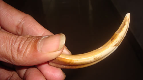 (Cadn.com.vn) - Thời gian qua, những người có thú vui “săn” đồ cổ, hàng “độc” tại TP Đà Nẵng kháo nhau về việc xuất hiện của một món hàng được gọi là “độc nhất vô nhị”, đó là chiếc răng nanh heo rừng hóa thạch. Ngoài việc “không đụng hàng”, người ta còn cho biết, chiếc răng nanh này còn có nhiều công năng khá đặc biệt, như: lửa sẽ tắt khi để gần, trừ tà ma, chữa một số bệnh hiểm nghèo. Vậy, thực hư về chiếc răng nanh heo rừng hóa thạch như thế nào? Chúng tôi cất công tìm hiểu và chuyển đến bạn đọc.