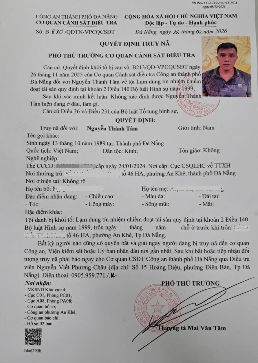 Ngày 27-2, Cơ quan CSĐT Công an TP Đà Nẵng cho biết, đã ra quyết định truy nã đối với Nguyễn Thành Tâm (1989, trú tổ 46 HA, phường An Khê, Đà Nẵng) về tội: “Lạm dụng tín nhiệm chiếm đoạt tài sản” quy định tại Điều 140 Bộ luật Hình sự.