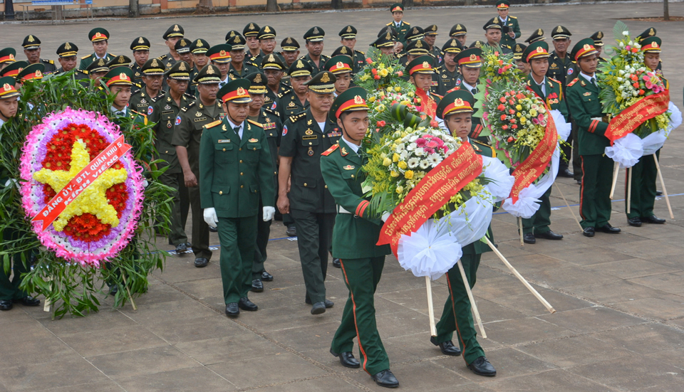 Các tướng lĩnh, sĩ quan, chiến sĩ Quân khu I, Quân đội Hoàng gia Campuchia dâng hương tại nghĩa trang liệt sĩ H. Đức Cơ, tỉnh Gia Lai. |