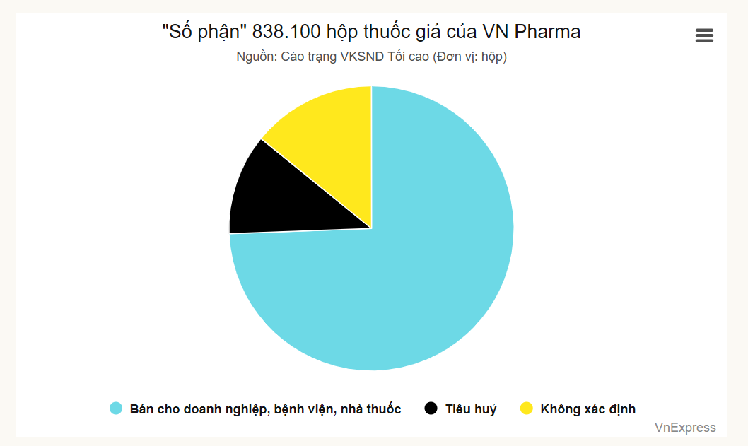 Cáo trạng xác định, trong 838.100 hộp thuốc giả được VN Pharma nhập khẩu, khoảng 75% được bán ra cho các doanh nghiệp, bệnh viện, nhà thuốc; 11% bị tiêu huỷ. Số còn lại "không xác định được".