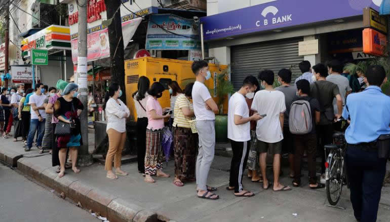 Người dân ở Yangon xếp hàng trước máy ATM của một ngân hàng đã đóng cửa vào ngày 1-2. |