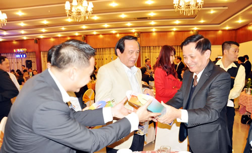 Chủ tịch UBND TP Văn Hữu Chiến trao quà cho các doanh nhân trong buổi gặp mặt. |