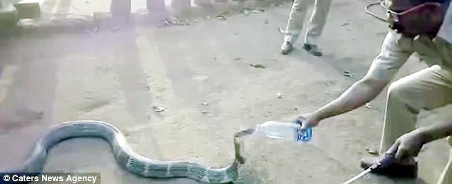 (Cadn.com.vn) - Rắn Hổ mang Chúa thường tránh tiếp xúc với con người, nhưng nó đã bò đến một ngôi làng Ấn Độ điên cuồng tìm nước uống do khu vực này đang hạn hán nghiêm trọng. Đoạn băng cho thấy một người đàn ông đổ chai nước qua đầu con rắn, trong khi tay kia cầm dụng cụ bắt rắn để đề phòng trường hợp bị nó tấn công.