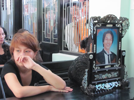 Mẹ của nạn nhân Trần Minh Hùng đau xót bên di ảnh con trai. |