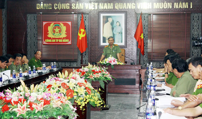 | Đại tá Lê Thanh Hải, Phó Giám đốc Công an TP Đà Nẵng phát biểu chỉ đạo kế hoạch bảo vệ cuộc thi trình diễn pháo hoa quốc tế Đà Nẵng 2015. |