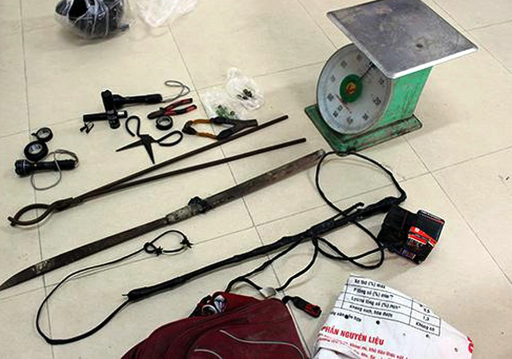 Tại hiện trường, lực lượng chức năng cũng thu giữ tang vật gồm 9 con chó, tổng trọng lượng 114kg; 1 bộ kích điện, 1 xe máy, 1 kiếm tự chế, 1 bình xịt hơi cay và nhiều dụng cụ để phạm tội khác.