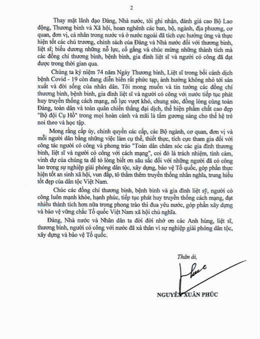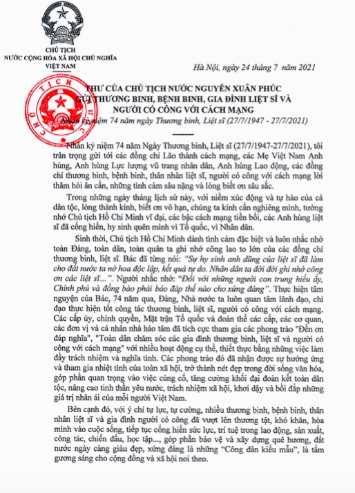 Nhân dịp 74 năm Ngày Thương binh, Liệt sĩ (27/7/1947-27/7/2021), Chủ tịch nước Nguyễn Xuân Phúc đã có thư gửi thương binh, bệnh binh, gia đình liệt sĩ và người có công với cách mạng.