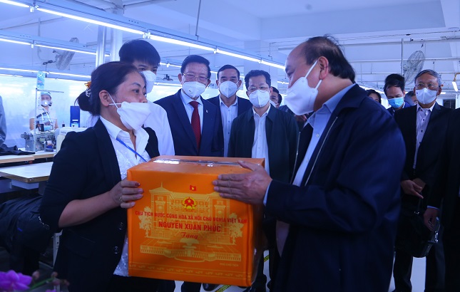 Chủ tịch nước Nguyễn Xuân Phúc tặng quà cho công nhân tại các dây chuyền sản xuất Cty Dệt may 29-3.