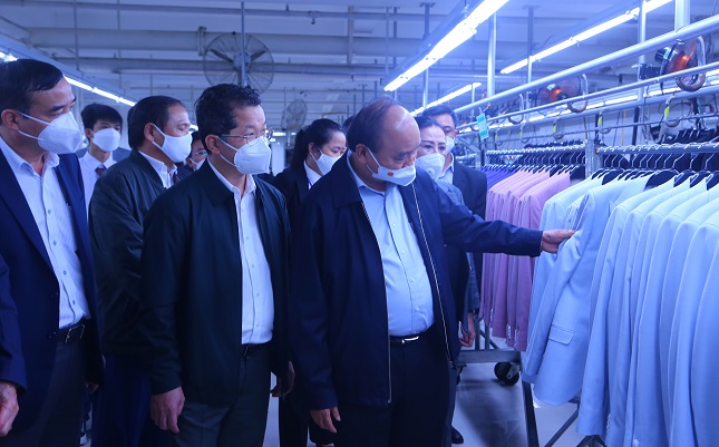 Chủ tịch nước Nguyễn Xuân Phúc cùng lãnh đạo thành phố Đà Nẵng thăm các dây chuyền sản xuất Cty Dệt may 29-3.