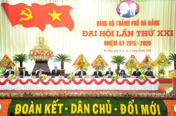 (Cadn.com.vn) - Với khẩu hiệu “Đoàn kết – Dân chủ - Đổi mới”, sáng nay (15-10), Đại hội Đại biểu Đảng bộ TP Đà Nẵng lần thứ XXI, nhiệm kỳ 2015-2020 đã chính thức khai mạc. Dự đại hội có các đồng chí: Trương Tấn Sang, Ủy viên Bộ Chí trị, Chủ tịch nước; Nguyễn Xuân Phúc, Ủy viên Bộ Chính trị, Phó Thủ tướng Chính phủ; Phan Diễn, nguyên Ủy viên Bộ Chính trị, Thường trực Ban Bí thư Trung ương Đảng, nguyên Bí thư Thành ủy Đà Nẵng; Nguyễn Văn Chi, nguyên Ủy viên Bộ Chính trị, Chủ nhiệm Ủy ban Kiểm tra Trung ương, nguyên Bí thư Tỉnh ủy Quảng Nam - Đà Nẵng; Trương Quang Được, nguyên Ủy viên Bộ Chính trị, Phó Chủ tịch Quốc hội, nguyên Bí thư Thành ủy Đà Nẵng; Vũ Ngọc Hoàng, Phó Trưởng ban Thường trực Ban Tuyên giáo Trung ương; Phan Đình Trạc, Phó Trưởng ban Thường trực Ban Nội chính Trung ương; Phạm Xuân Đương, Phó Trưởng ban Thường trực Ban Kinh tế Trung ương; Nguyễn Đức Hải, Phó Chủ nhiệm Ủy ban Kiểm tra Trung ương; Lê Chiêm, Thứ trưởng Bộ Quốc phòng; Nguyễn Đức Hạt, nguyên Phó Trưởng ban Thường trực Ban Tổ chức Trung ương, nguyên Bí thư Thành ủy Đà Nẵng; Thượng tướng Lê Thế Tiệm, nguyên Thứ trưởng Bộ Công an; Trần Quang Phương, Chính ủy Quân khu 5; Nguyễn Ngọc Quang, Bí thư Tỉnh ủy Quảng Nam.