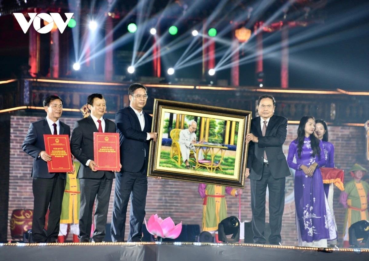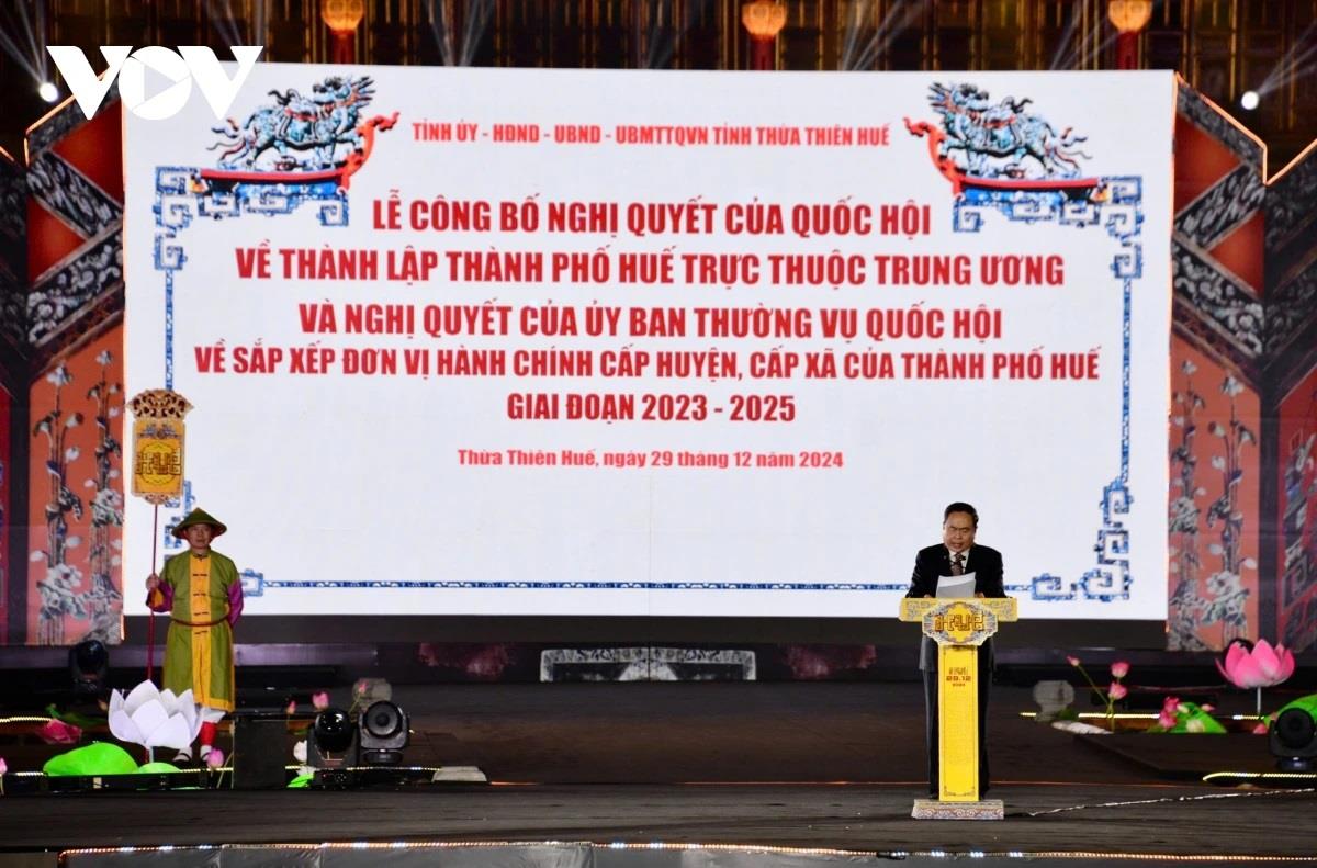 Phát biểu tại buổi lễ, Chủ tịch Quốc hội Trần Thanh Mẫn cho biết, tại Kỳ họp thứ 8, Quốc hội khóa XV đã thông qua Nghị quyết thành lập thành phố Huế trực thuộc Trung ương với tỷ lệ đại biểu Quốc hội tán thành rất cao. Từ ngày 01/01/2025, cùng với TP. Hà Nội, TP. Hồ Chí Minh, TP Hải Phòng, TP. Đà Nẵng và TP. Cần Thơ, Huế trở thành thành phố trực thuộc trung ương thứ 6 của Việt Nam. Đây không chỉ là niềm tự hào, ước nguyện từ lâu của các thế hệ lãnh đạo, Nhân dân thành phố Huế, mà còn mở ra một giai đoạn mới đầy triển vọng cho một địa phương có bề dày lịch sử, văn hóa, một vùng đất địa linh nhân kiệt.