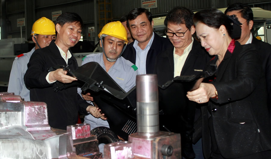 Đoàn công tác thăm dây chuyền sản xuất tại nhà máy ô-tô Thaco Chu Lai. |