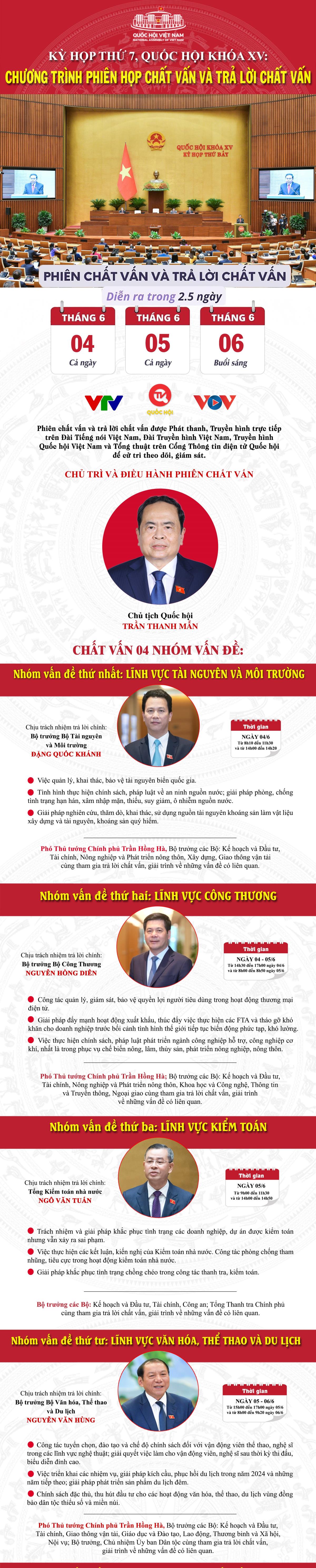 Theo đó, sau 2,5 ngày làm việc nghiêm túc và trách nhiệm cao, đến thời điểm này, Quốc hội đã hoàn thành toàn bộ chương trình phiên chất vấn và trả lời chất vấn tại Kỳ họp thứ Bảy, Quốc hội Khóa XV đối với 4 nhóm vấn đề thuộc trách nhiệm chính của Bộ trưởng Bộ Tài nguyên và Môi trường Đặng Quốc Khánh, Bộ trưởng Bộ Công Thương Nguyễn Hồng Diên, Bộ trưởng Bộ Văn hóa, Thể thao và Du lịch Nguyễn Văn Hùng và Tổng Kiểm toán Nhà nước Ngô Văn Tuấn.