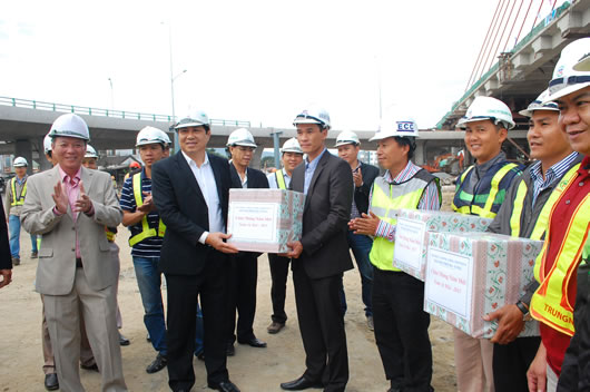 Chủ tịch UBND TP tặng quà Tết cho các đơn vị thi công. |