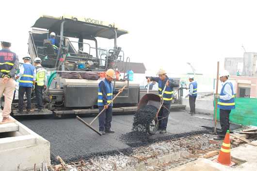 | Các phương tiện thi công thảm bê tông nhựa ở đầu cầu dẫn phía Nam đường Điện Biên Phủ. |