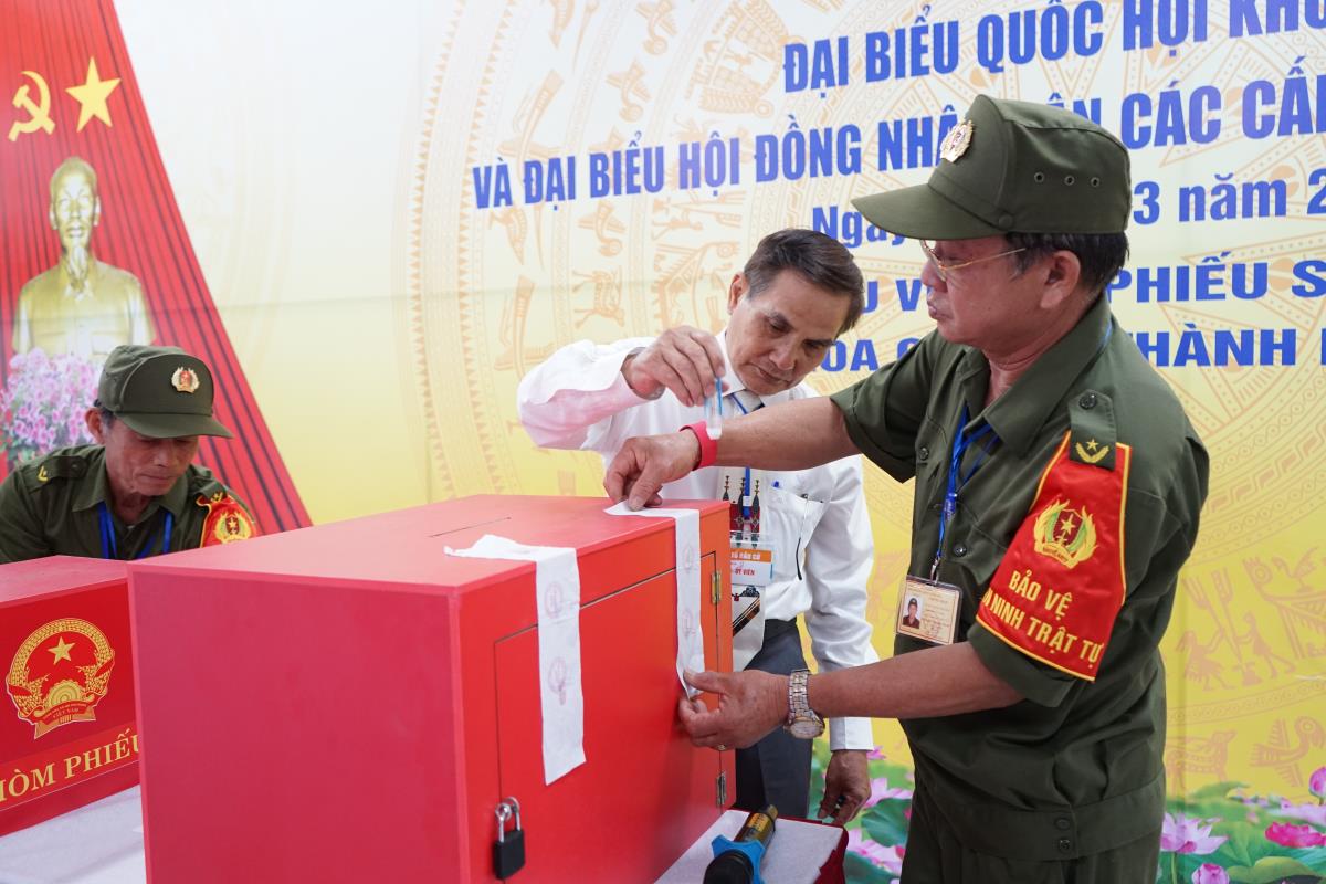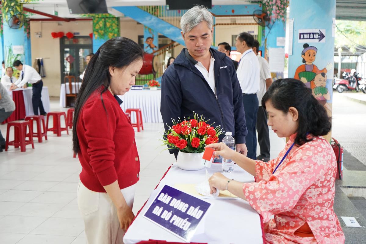 Chủ tịch Ủy ban MTTQ Việt Nam thành phố Đà Nẵng Lê Trí Thanh dự khai mạc, bỏ phiếu tại Khu vực bỏ phiếu số 39, phường Hòa Cường