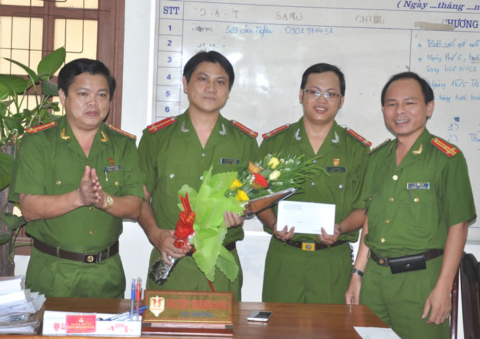 Chiều 14-8, Đại tá Trần Phước Hương - Trưởng CAQ Hải Châu và thượng tá Trần Văn Tám - Phó CAQ Hải Châu thay mặt Ban Chỉ đạo 138 Q. Hải Châu và CAQ thăm, thưởng nóng 1 triệu đồng cho CBCS Đội CSĐTTPVMT. Thay mặt Ban Chỉ đạo 138 Q. Hải Châu và CAQ, đại tá Trần Phước Hương biểu dương kết quả đấu tranh của Đội CSĐTTPVMT trong thời gian qua nhằm chào mừng kỷ niệm 70 năm Ngày truyền thống CAND Việt Nam và mong rằng thời gian tới, Đội tiếp tục phát huy, đấu tranh có hiệu quả hơn nữa với các đối tượng mua bán, tàng trữ, sử dụng trái phép chất ma túy, góp phần đảm bảo ANCT-TTATXH trên địa bàn.
