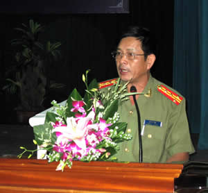 Đại tá Lê Văn Tam phát biểu tại hội nghị. |