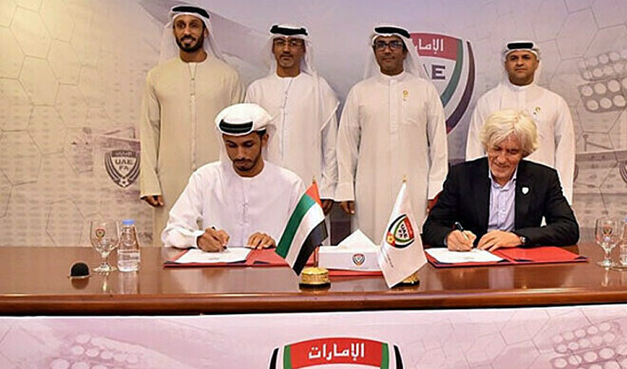 HLV Ivan Jovanovic (phải) trong buổi ký hợp đồng với Liên đoàn Bóng đá UAE. |