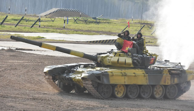 Chiều 6-8 (giờ địa phương), tại thao trường Alabino, ngoại ô thủ đô Moscow, Nga, kíp xe thứ 2 của đội tuyển xe tăng Quân đội Nhân dân Việt Nam tham gia Army Games 2019 giành ngôi đầu bảng với thành tích ấn tượng 31 phút 5 giây. - Kíp xe Việt Nam vẫy cờ chào khán giả khi về đích kết thúc chặng đua - Ảnh: MỸ HẠNH |