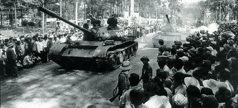 Năm 1975, khi thời cơ chiến lược xuất hiện, nhờ có nhân dân tích cực chuẩn bị chiến trường, phối hợp chiến đấu, quân đội có điều kiện tiến công thần tốc, thực hiện trận quyết chiến chiến lược trong cuộc Tổng tấn công và nổi dậy mùa Xuân 1975 mà đỉnh cao là chiến dịch Hồ Chí Minh lịch sử, giải phóng hoàn toàn miền Nam, thống nhất đất nước. Trong ảnh: Xe tăng Quân giải phóng tiến vào giải phóng Sài Gòn trong niềm vui hân hoan của nhân dân - Ảnh: Lâm Tấn Tài - TTXVN |