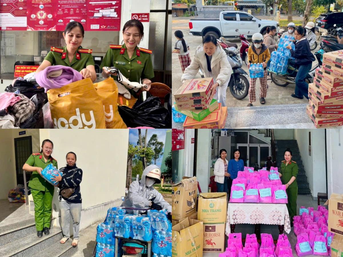 Tại Quảng Ngãi, các điểm tiếp nhận hàng cứu trợ cũng liên tục được mở. Hình ảnh cán bộ, chiến sĩ Công an cùng người dân phân loại, đóng gói rồi vận chuyển hàng cứu trợ đã trở nên quen thuộc. Hàng trăm tấn hàng hóa gồm quần áo, nhu yếu phẩm được đưa lên xe chuyển vào vùng ngập. Thượng tá Đặng Việt Dũng- Trưởng phòng Cảnh sát PCCC và CNCH Công an tỉnh Quảng Ngãi chia sẻ: "Tinh thần tương thân tương ái là mệnh lệnh từ trái tim mỗi cán bộ, chiến sĩ. Ngoài cứu nạn, chúng tôi còn trực tiếp mang quà đến từng hộ dân vùng ngập sâu". Các tổ chức đoàn thể trong Công an tỉnh như Đoàn Thanh niên và Hội Phụ nữ cũng phát động quyên góp rộng rãi. Hàng hóa được tập hợp và chuyển liên tục vào Đắk Lắk, nơi chịu thiệt hại nặng nề nhất. Công an tỉnh cũng bố trí phương tiện đảm bảo xe chở hàng cứu trợ được lưu thông thông suốt.