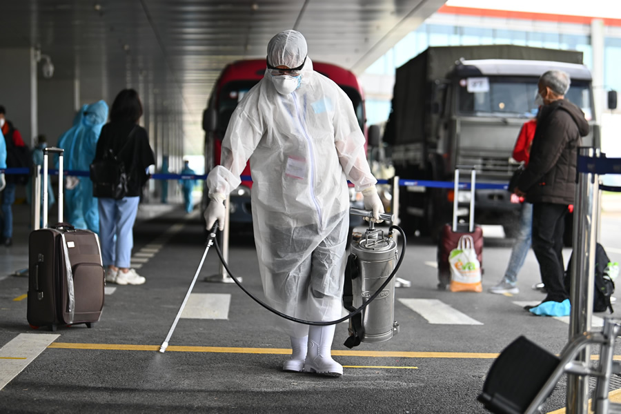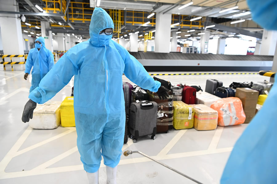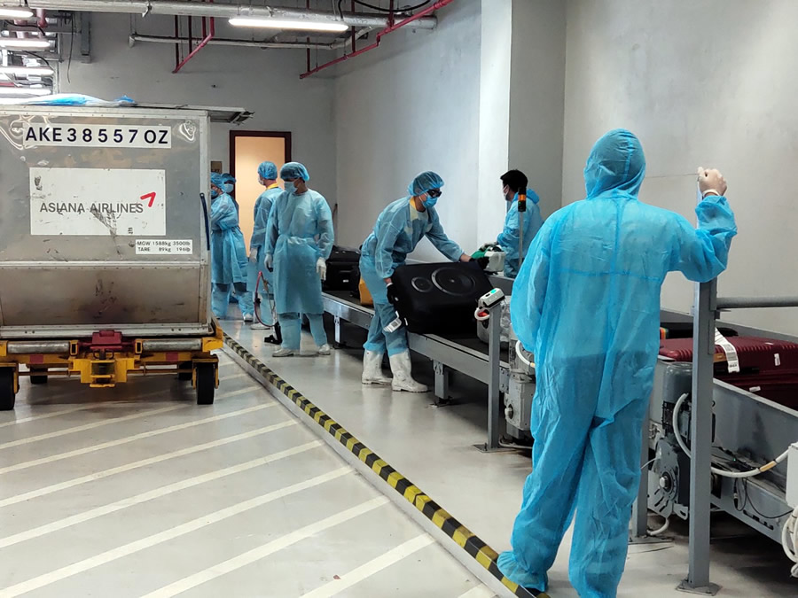 Sau khi hoàn tất khâu đón khách, toàn bộ khu vực làm thủ tục, luồng di chuyển của hành khách và các thiết bị tại sân bay đều được phun xịt khử trùng, phòng lây nhiễm dịch bệnh.