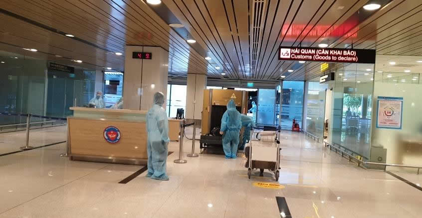 Cụ thể, hành khách hạ cánh xuống sân bay được đo thân nhiệt, khai báo y tế bắt buộc và làm thủ tục nhập cảnh, hải quan tại khu vực riêng biệt. Hành khách cũng được hướng dẫn đeo khẩu trang, giữ khoảng cách an toàn. Hành lý xách tay và hành lý ký gửi đều được khử trùng bằng chất khử trùng chuyên dụng.