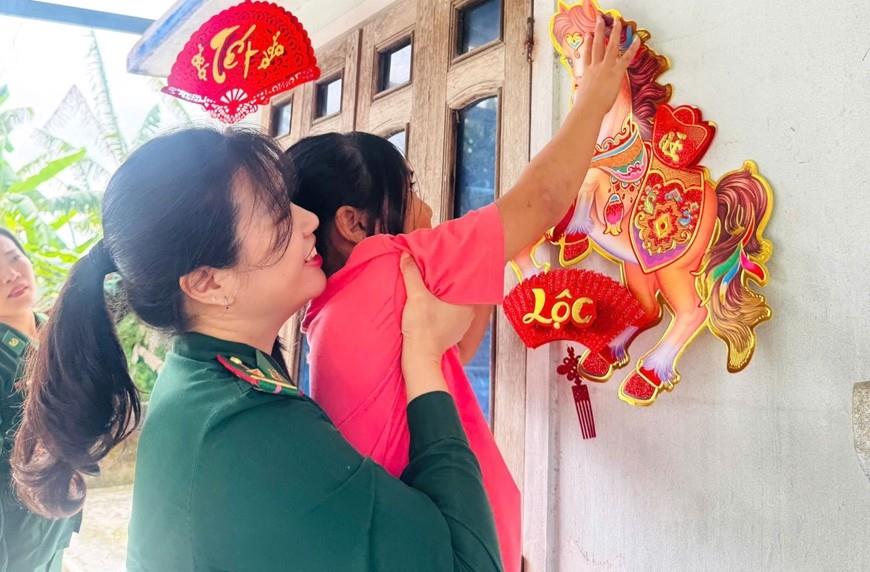 Không chỉ hỗ trợ vật chất, các “mẹ nuôi Biên phòng” còn cố gắng mang đến cho các con nuôi những ký ức tuổi thơ tươi đẹp. Trước Tết Bính Ngọ năm 2026, với mong muốn các con nuôi có một cái Tết ấm áp hơn, Hội Phụ nữ BĐBP thành phố đã đến thăm, cùng các em trang trí nhà cửa đón Xuân. Thiếu tá QNCN Đinh Thị Vân Trang, Thiếu tá QNCN Nguyễn Thanh Vân và Trung tá QNCN Hoàng Anh Thơ đã xin nghỉ làm một ngày để cùng các hội viên khác vượt quãng đường gần 100km đến thăm hai gia đình, mang theo nhiều đồ trang trí và quà Tết.