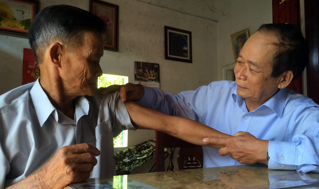 | Anh hùng LLVTND Huỳnh Thúc Bá (phải) xem lại vết mổ ngày trước của CCB Ngô Cần. |