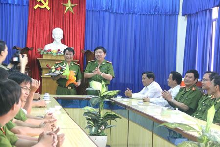 Đại tá Phan Ngọc Ngự- Phó Giám đốc CA tỉnh Quảng Nam (bìa phải) thưởng nóng cho Phòng CSĐTTPVTTXH . |