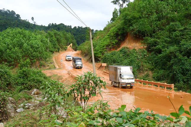 Đoàn thiện nguyện phải vượt qua những đoạn đường bị sạt lở để đến với Trà Nam.