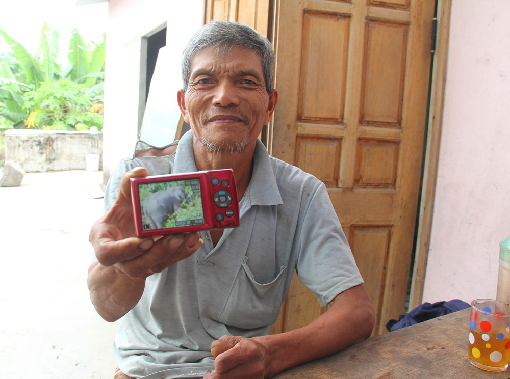 “Thấy tôi “có duyên” với đàn voi rừng, sau khi được thành lập, Ban quản lý khu bảo tồn voi giao cho tôi một kẻng lớn kèm theo một chiếc máy ảnh kỹ thuật số để tôi “tác nghiệp” mỗi khi gặp voi. Vừa rồi đàn voi rừng 8 con, trong đó có một con nhỏ mà các nhà khoa học chụp được cũng do tôi dẫn họ vào đó. Ngoài đàn voi trên, ở địa phương còn có một đàn voi 5 con, trong đó có một con voi già ngà rất dài…”, vừa nói, ông Bình vừa đưa chiếc máy ảnh nhỏ cho chúng tôi xem, trong đó có một số hình ảnh voi do chính ông Bình chụp được.