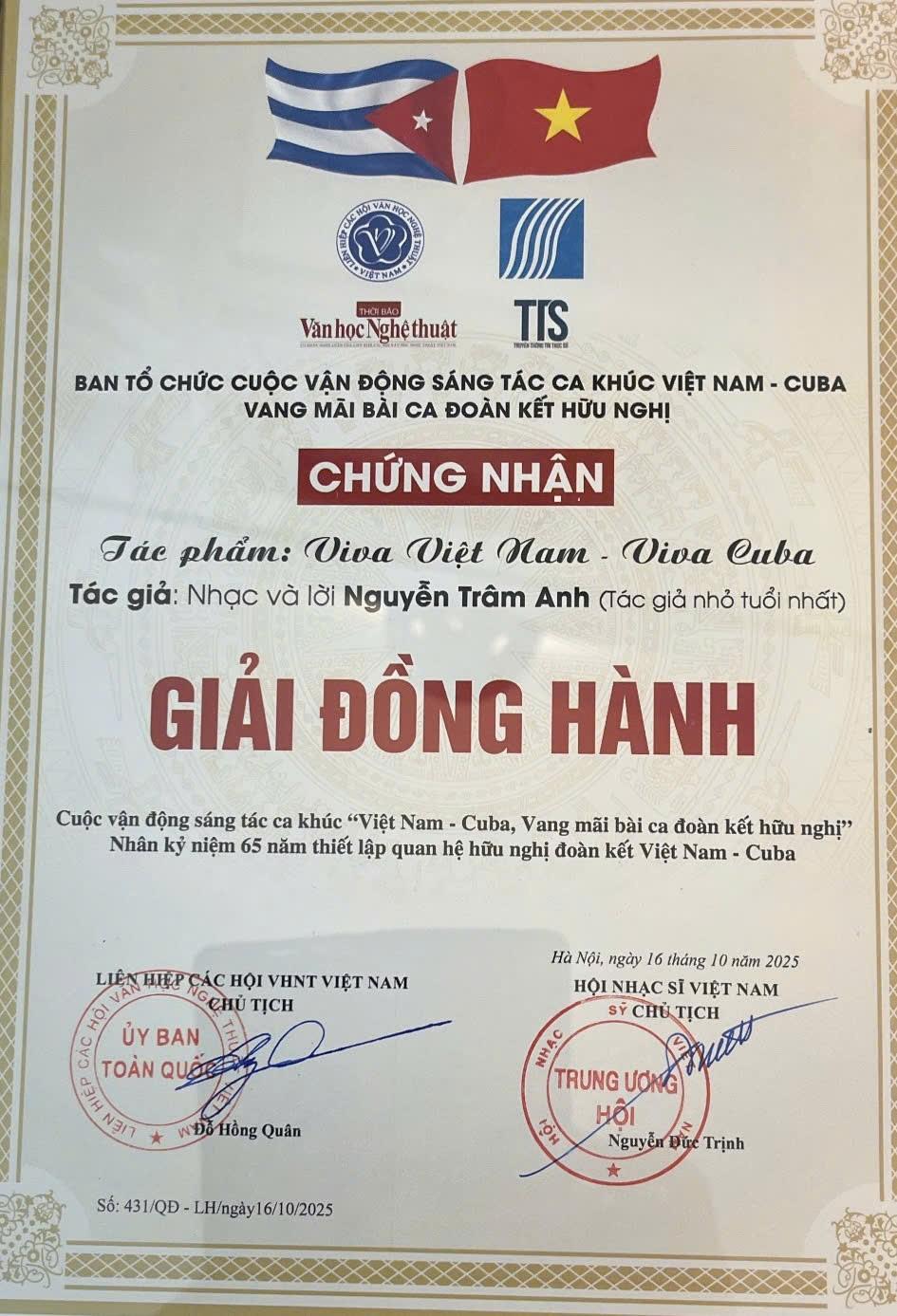 Trong Lễ tổng kết chương trình vận động ủng hộ Nhân dân Cuba “65 năm nghĩa tình Việt Nam - Cuba” vừa được tổ chức tại Hà Nội, cô bé 10 tuổi Nguyễn Trâm Anh đã để lại nhiều ấn tượng khi được vinh danh là tác giả nhỏ tuổi nhất đạt giải Đồng hành trong Cuộc vận động sáng tác ca khúc “Việt Nam - Cuba, vang mãi bài ca đoàn kết, hữu nghị”.