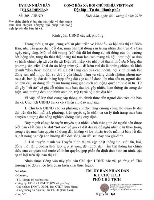 Theo nội dung Công văn số 368/UBND của UBND thị xã Điện Bàn về việc "Chấn chỉnh thông tin thất thiệt và tình trạng mua bán chuyển nhượng trái phép đất nông nghiệp trên địa bàn thị xã" nêu rõ: Trong thời gian qua một số đối tượng "cò đất" lợi dụng sự sôi động của thị trường bất động sản, tung tin trên các trang mạng xã hội như, một số đơn vị cấp xã của thị xã sẽ sáp nhập vào TP Đà Nẵng, địa phương sắp triển khai những dự án hàng trăm tỷ đồng... Chính những nhóm này cũng mua đi bán lại đất đai bằng hợp đồng đặt cọc ảo để đánh lừa nhà đầu tư, người dân có nhu cầu mua đất. Từ đó sẽ gây "sốt ảo" giá đất để thu lợi nhuận, gây nhiễu loạn thị trường, ảnh hưởng đến tình hình ANTT trên địa bàn. UBND thị xã Điện Bàn khẳng định những tin đồn trên là thất thiệt.
