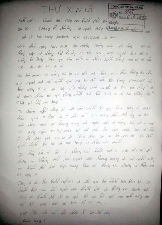 Sau khi sự việc được làm sáng tỏ, Phương đã viết thư xin lỗi người dân Đà Nẵng |