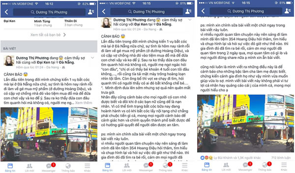 Làm việc trực tiếp với Dương Thị Phượng, cô gái cho rằng: "Vào khoảng 16 giờ ngày 28-5-2016, cô có đến tiệm mỹ phẩm "Kềm Nghĩa" (số 354 - Hoàng Diệu, Đà Nẵng) để mua mỹ phẩm. Tại đây, cô thấy hai vợ chồng cùng một bé trai khoảng 4 tuổi đang ở cửa hàng cùng rất nhiều khách hàng. Khoảng 15 phút sau, cô nghe mọi người trong tiệm cùng chị phụ nữ nói trên la lên và nói rằng cháu bé bị bắt cóc. Ngay lập tức, cô tham gia cùng mọi người tìm kiếm cháu bé nhưng không thấy. Vậy là, rạng sáng 29-5-2016, cô đã đăng tải thông tin việc mình tận mắt chứng kiến một vụ bắt cóc trẻ em tại một tiệm mua bán mỹ phẩm ở đường Hoàng Diệu. Đến sáng 31-5-2016, cô đến tiệm mỹ phẩm "Kềm Nghĩa" để tìm hiểu thông tin thì được chủ tiệm thông báo là cháu bé do đi lạc đã được cha mẹ tìm thấy. Vậy là, tối cùng ngày, cô đã gỡ bỏ thông tin nêu trên".