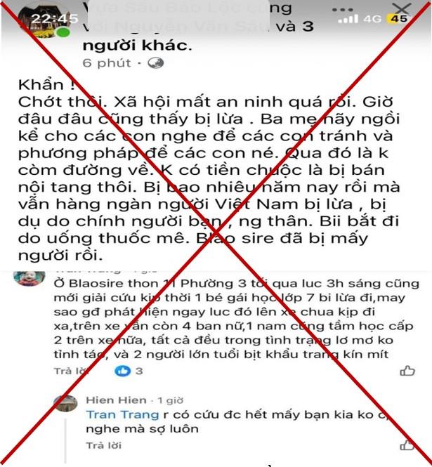 Qua xác minh thông tin “giải cứu nữ học sinh bị bắt cóc” ở phường 3 Bảo Lộc (tỉnh Lâm Đồng) lan truyền trên mạng xã hội, ngày 11-9, Công an tỉnh Lâm Đồng xác định thông tin trên hoàn toàn sai sự thật. Cơ quan Công an khẳng định, sự việc không liên quan đến các hành vi lừa đảo hay mua bán người. Do đó, hành vi tung tin giả, bịa đặt là vi phạm pháp luật, gây mất ANTT và sẽ bị xử lý nghiêm theo quy định.