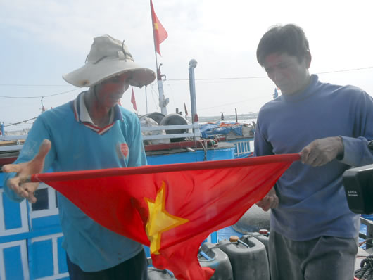 Ngư dân Lý Sơn treo cờ tổ quốc trước khi cho tàu vươn khơi. |