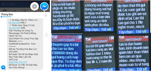 Mới vừa ngủ dậy, anh Nguyễn Thanh Tùng (trú P. Hòa Minh, Liên Chiểu, Đà Nẵng) vớ chiếc điện thoại để “lướt” web thì nhận được tin nhắn từ một tài khoản Facebook có tên Messenger với nội dung: “Chúc mừng bạn đã may mắn trúng thưởng gồm 1 xe máy Liberty 150cc I.E (trị giá 68.500.000 đồng), 1 phiếu tặng quà trị giá 50 triệu đồng. Giải thưởng do Cty Messenger và Piagio đồng hành trài trợ. Quý khách vui lòng truy cập Website: Giainhatfacebook.com. Mã dự thưởng của bạn là (OG1202) để hoàn thiện hồ sơ nhận giải. Mọi thắc mắc xin liên hệ Hotline... để được tư vấn và giải đáp. Xin chúc mừng”. Đọc xong tin nhắn anh Tùng mỉm cười bởi tự nhiên trúng số ngay từ sáng sớm nên truy cập vào các địa chỉ website thì được thông báo là không tồn tại, gọi vào số điện thoại theo hướng dẫn thì không có ai nghe máy. Anh hỏi bạn bè về giải thưởng và thông tin thì được biết nhiều người bạn của anh Tùng cũng nhận được tin nhắn tương tự nhưng chẳng ai làm theo, bởi đó chỉ là trò lừa đảo.