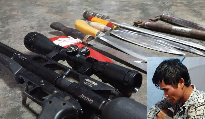 Đối tượng T.V.T và số súng đạn, hung khí tàng trữ trái phép. |